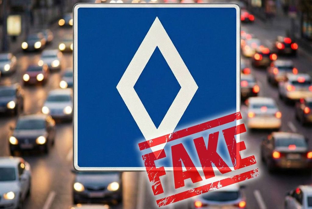 Мережею активно поширюється неправдива інформація про нібито запровадження в Україні нового дорожнього знака — «білий ромб на синьому фоні». Цей знак, за твердженнями фейкових повідомлень, мав би позначати смугу руху, призначену для громадського транспорту, таксі, електромобілів, а також легкових авто з двома і більше пасажирами.