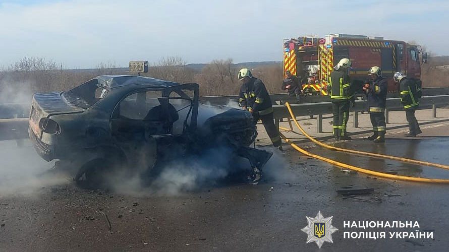 За попередньою інформацією, автомобіль Daewoo Lanos під час руху зіткнувся з відбійником та загорівся. На місце події оперативно прибули всі екстрені служби.