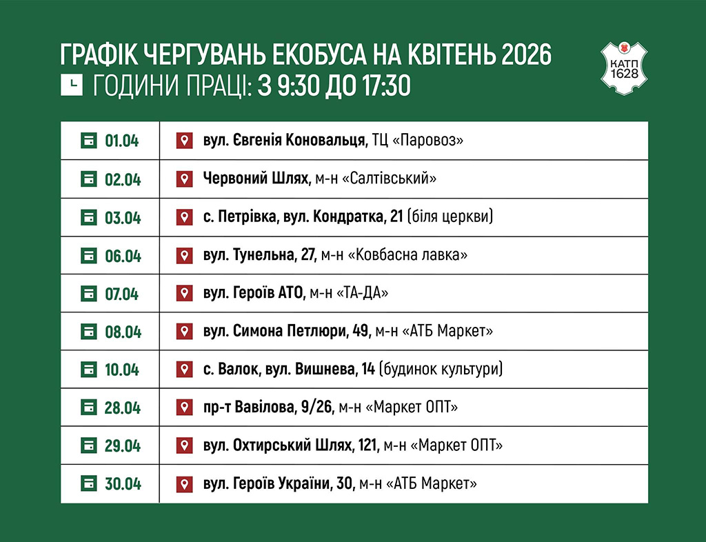 Графік роботи екобуса у Полтаві на квітень 2026 року